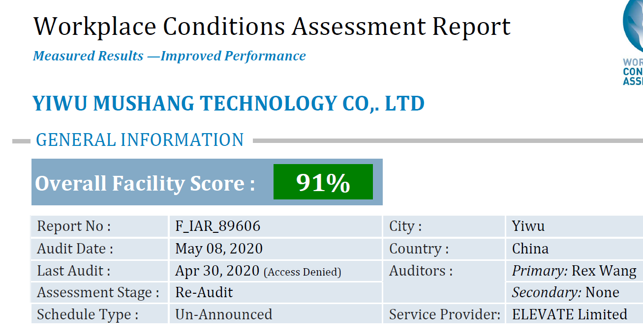 祝義烏市木上電子科技有限公司在創(chuàng)思維驗(yàn)廠網(wǎng)輔導(dǎo)下順利通過ELEVATE審核的WCA驗(yàn)廠并取得91分