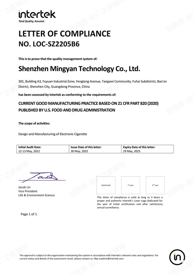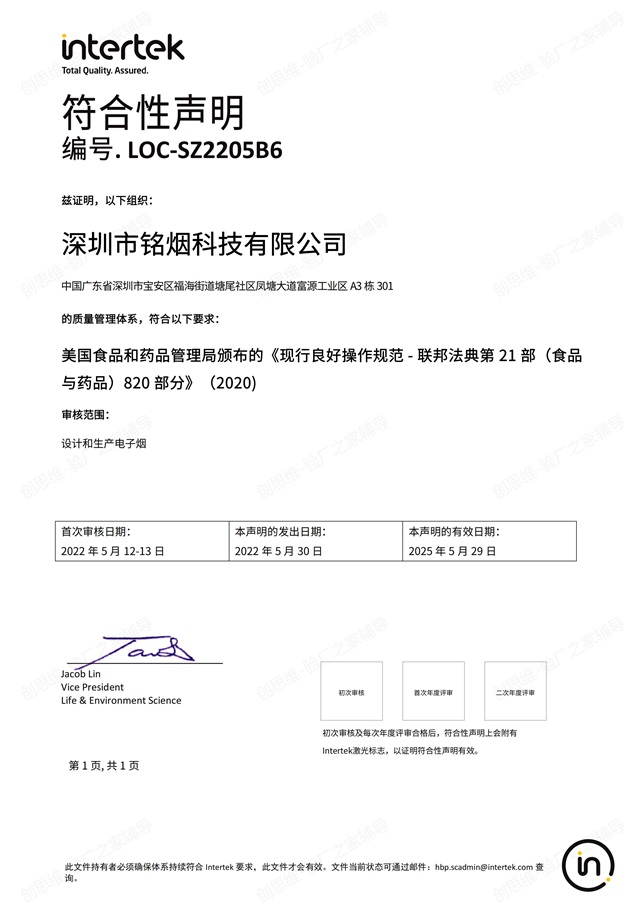 2022年5月12-13日,國際認證機構INTERTEK(ITS) 專家及深圳市創思維企業管理技術有限公司技術經理、GMP輔導老師一起,對深圳銘煙電子煙、電子霧化器生產基地、煙油灌裝車間、包裝車間、成品倉庫、更衣室、化學品倉等進行了GMP 820認證現場檢查。經過2天嚴格、細致的檢查,順利通過檢查,并取得GMP-820認證證書。