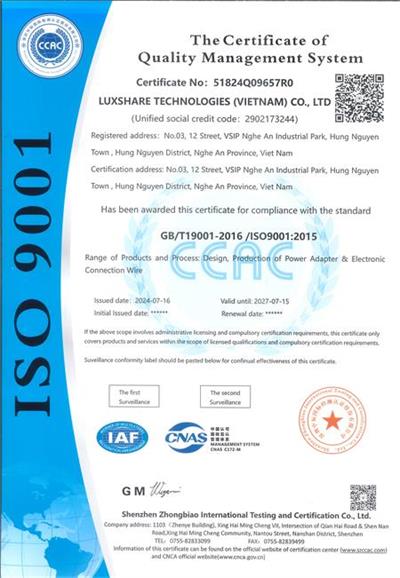祝賀立訊技術(越南)有限公司 LUXSHARE TECHNOLOGIES (VIETNAM) CO., LTD 2024年快速通過ISO9001認證
